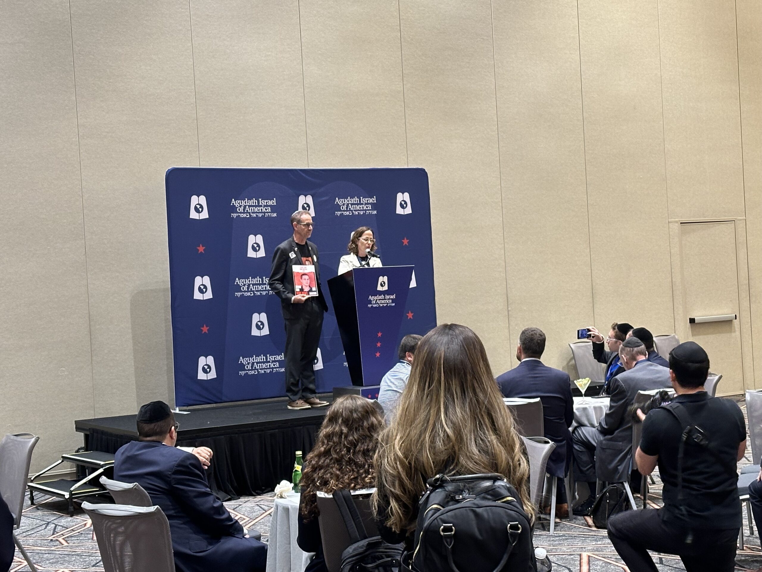 Orna and Ronen Neutra address an event on Tuesday sponsored by Agudath Israel on the sidelines of the Democratic National Convention in Chicago.