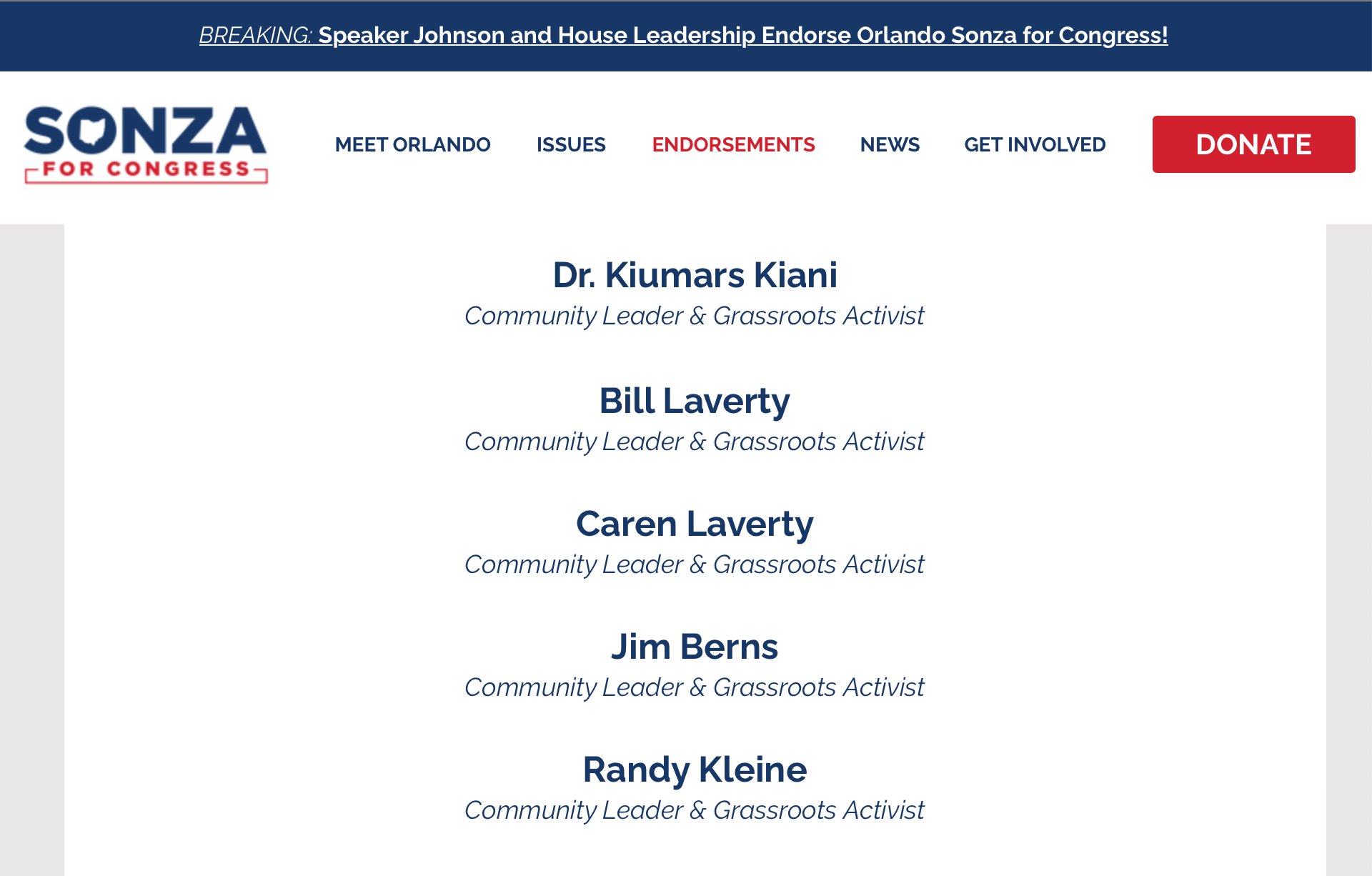 Sonza’s congressional campaign website’s endorsements page listed Kiani as a “community leader & grassroots activist,” one of 35 named on the page. The Sonza campaign’s X account also posted that list of endorsements, including Kiani, in July 2023. The endorsements page on Sonza’s website states he is “proud of the long list of elected officials, grassroots activists, and community leaders who have endorsed his candidacy.”