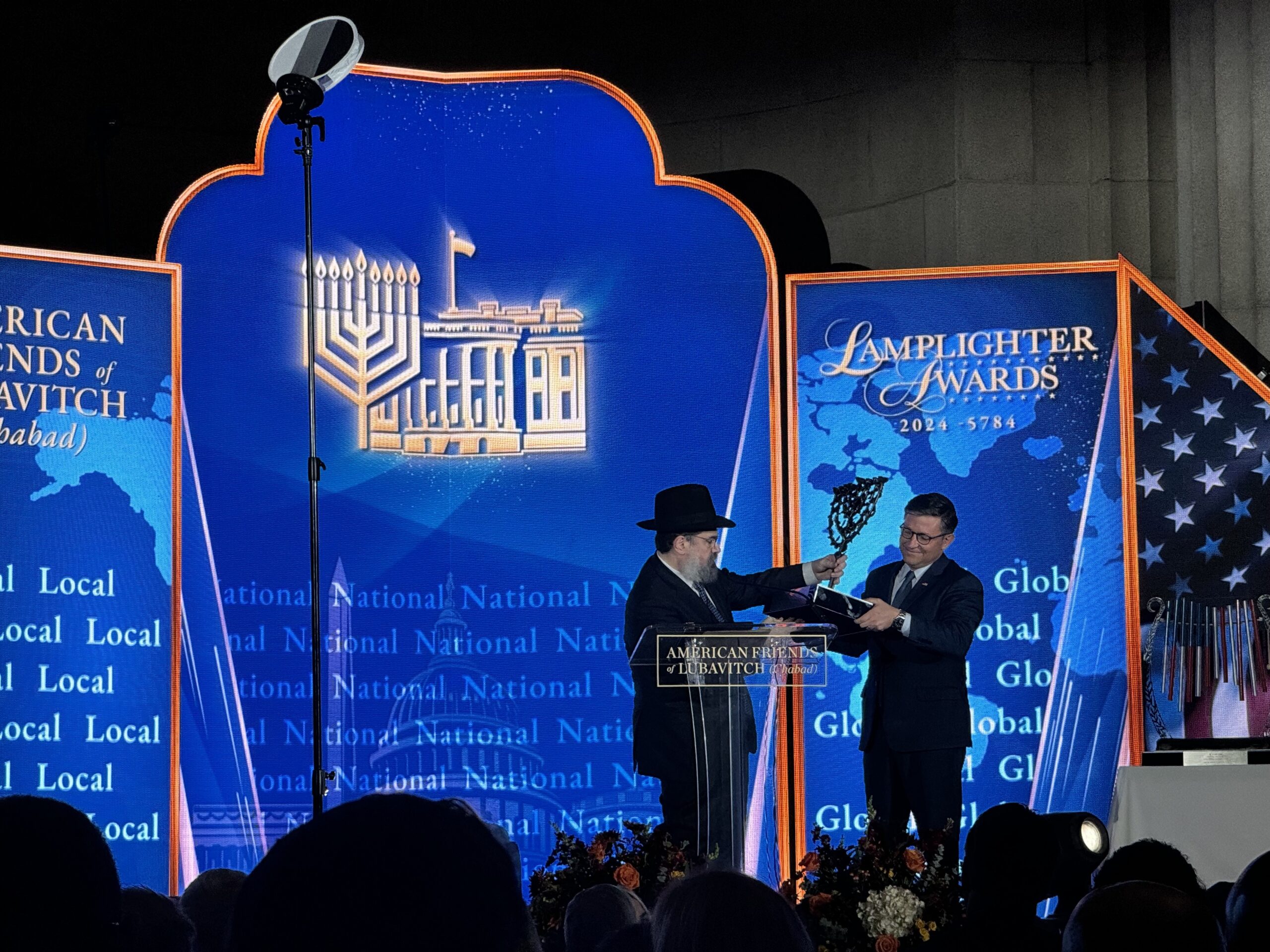 As klezmer music echoed through the Andrew Mellon Auditorium in Washington, D.C., last night, dozens of members of the House and Senate gathered alongside more than 100 Jewish leaders, ambassadors and politicos for the annual American Friends of Lubavitch (Chabad) Lamplighter Awards gala. At the cocktail reception, guests noshed on kosher charcuterie and sushi as they heard remarks from several pro-Israel stalwarts in Congress including Reps. Ritchie Torres (D-NY), Dan Goldman (D-NY), Rob Menendez (D-NJ), Tim Kennedy (R-NY), and Joe Morelle (D-NY).