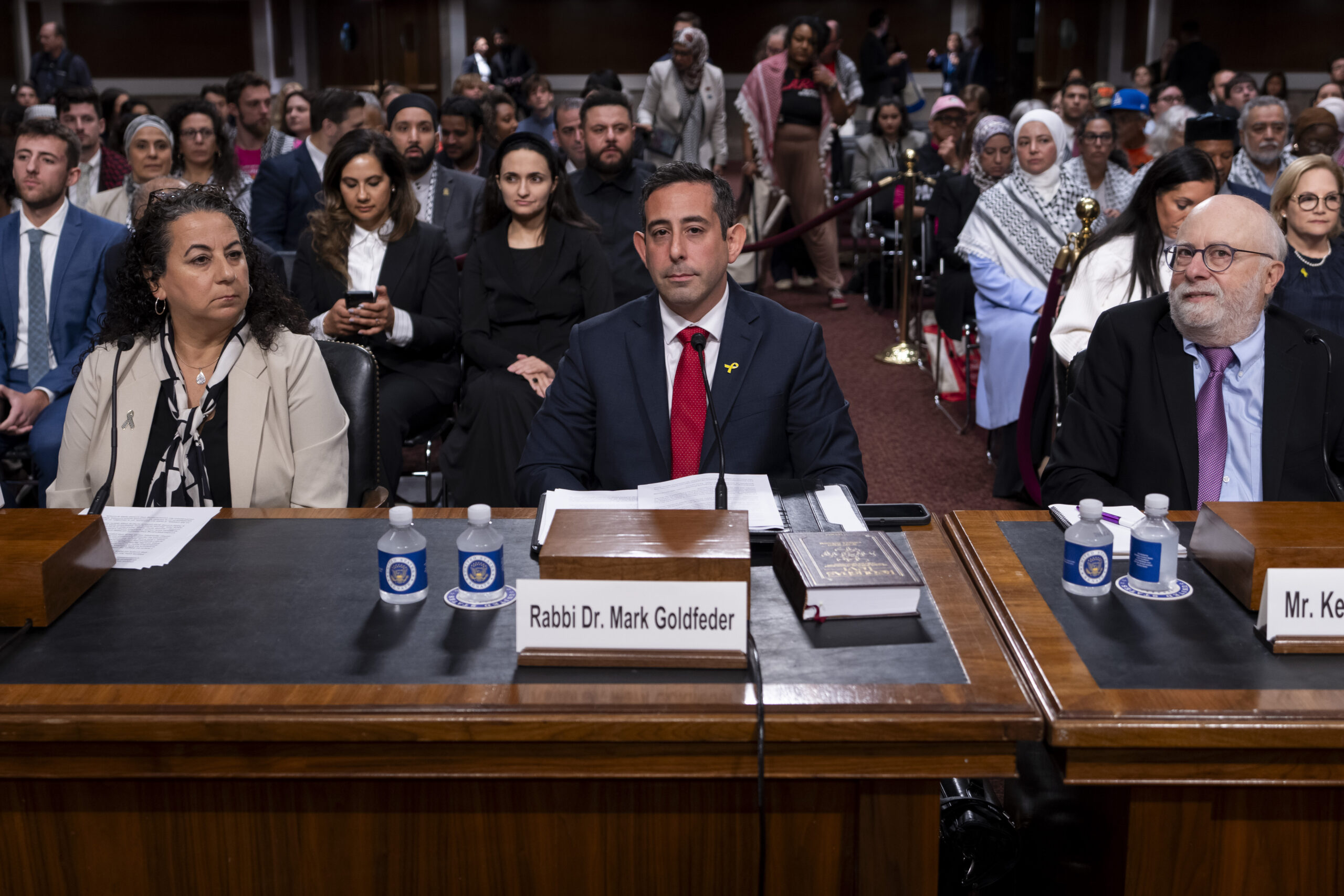 Maya Berry, Executive Director of the Arab American Institute, left, Rabbi Mark Goldfeder, Director of the National Jewish Advocacy Center, center, and Kenneth Stern, Director of the Bard Center for the Study of Hate, attend a Senate Judiciary Committee hearing on how to stem the rise in hate crimes in America, at the Capitol in Washington, Tuesday, Sept. 17, 2024.