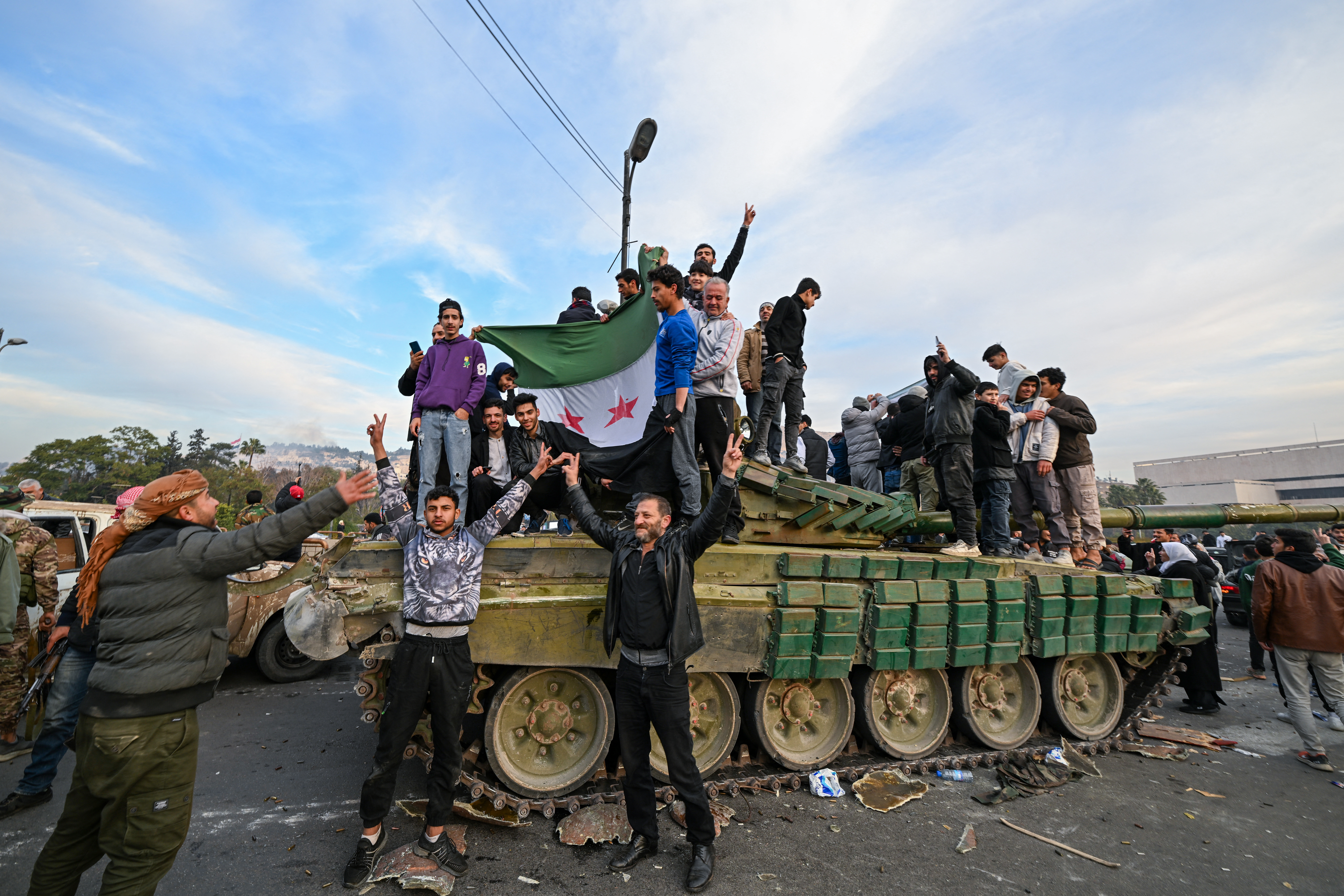 People celebrate with anti-government fighters at Umayyad Square in Damascus on December 8, 2024.