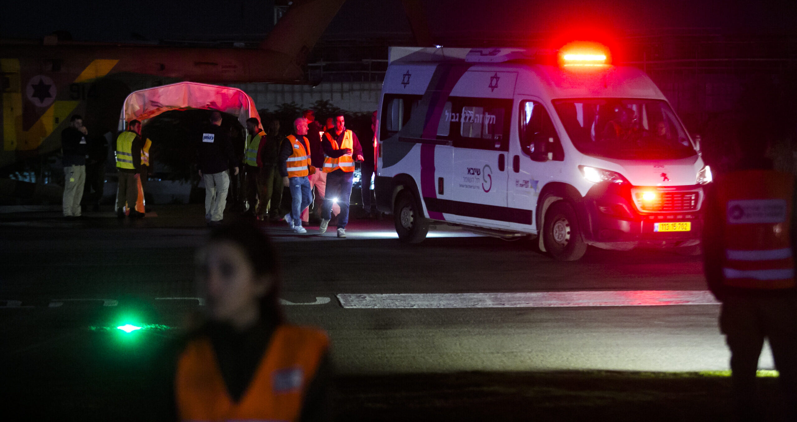 Medical workers take out released hostages from an Helicopter at Sheba hospital on November 28, 2023 in Ramat Gan, Israel.