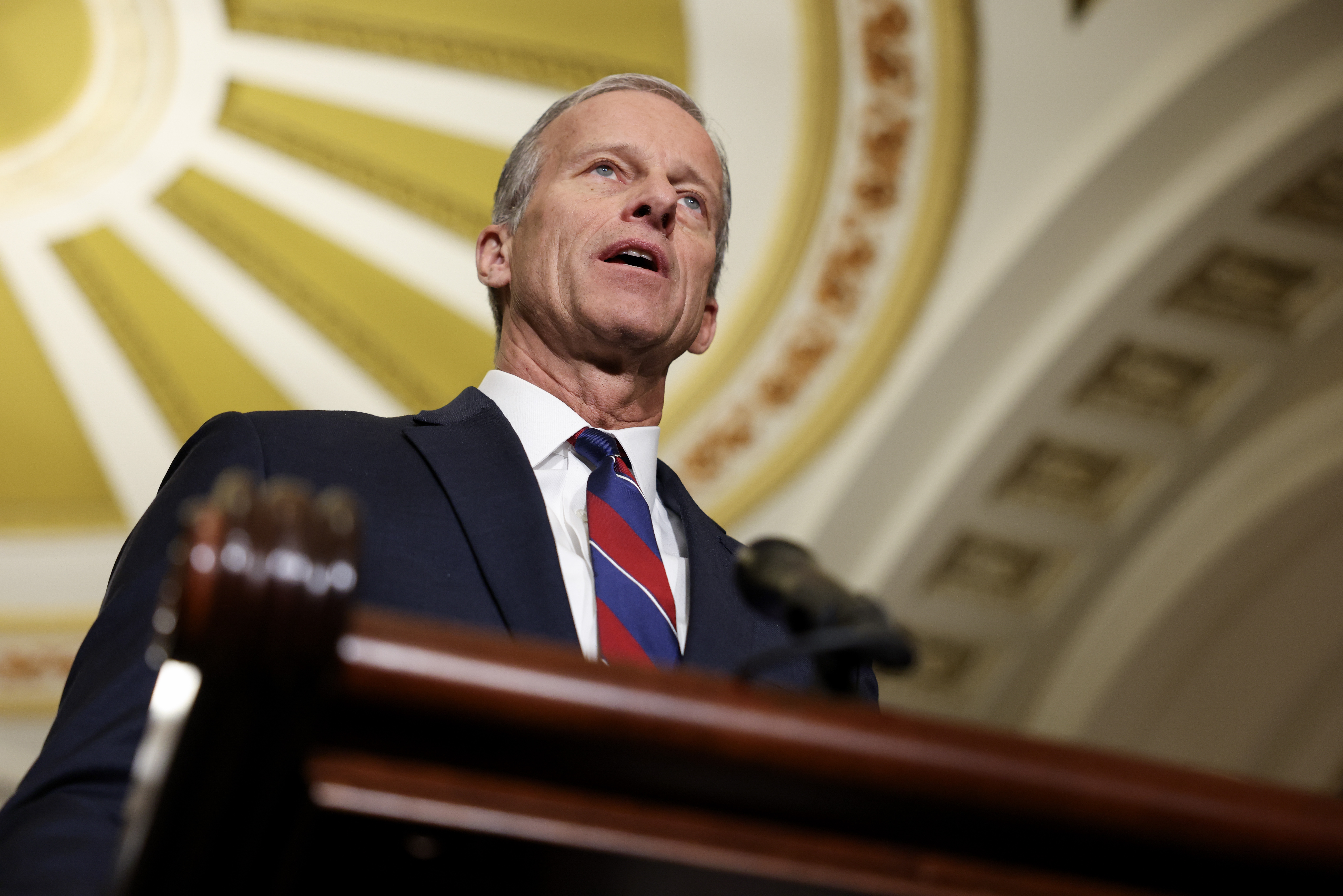 Sen. Majority Leader John Thune (R-SD) calls on reporters following the weekly Senate Republican caucus policy luncheon at the U.S. Capitol on January 14, 2025 in Washington, DC. Senators spoke about the Laken Riley Act which was named after a nursing student who was murdered in February 2024 by Jose Ibarra, a migrant from Venezuela who crossed the border in September 2022, that could give state attorney generals far-reaching veto power over federal immigration policy.