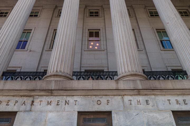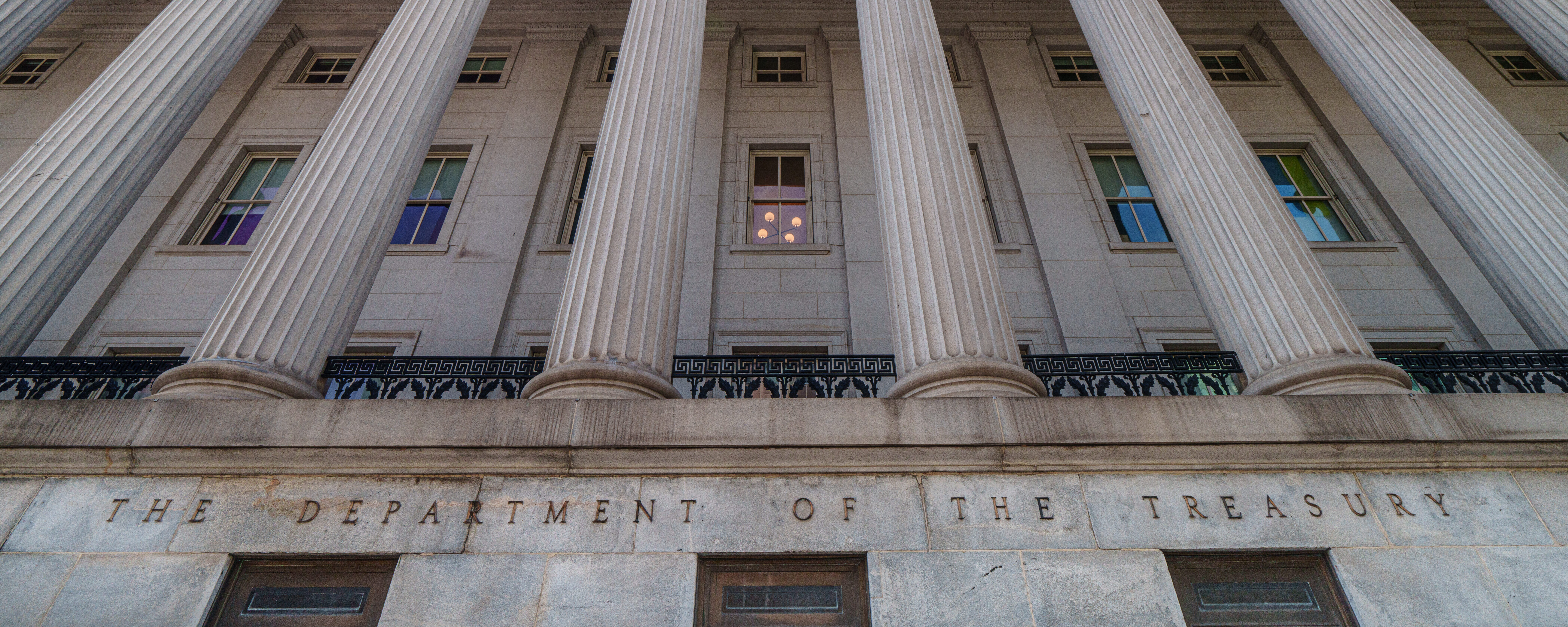 The sun flares over the top of the side entrance to the U.S. Treasury Department Building on August 18, 2024, in Washington, DC.
