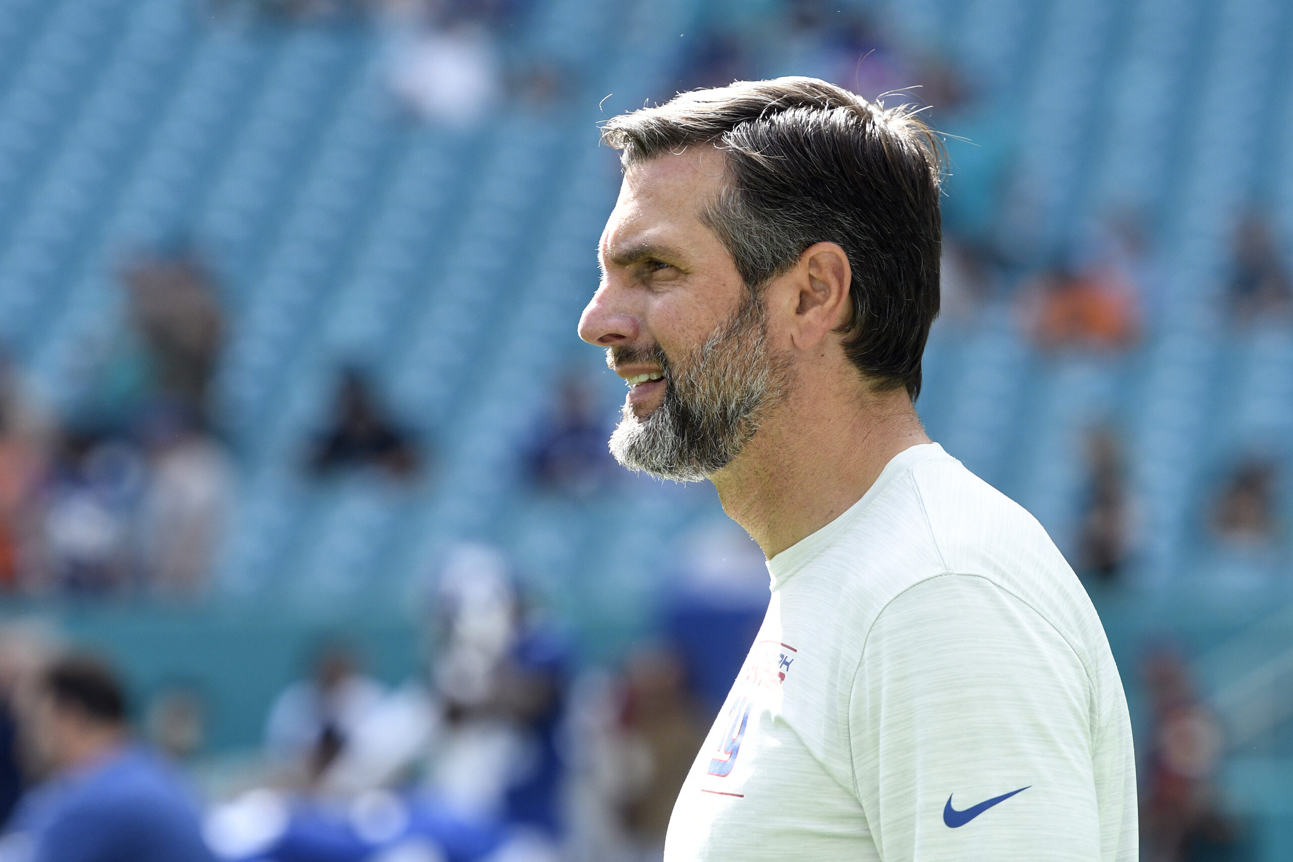 New York Giants Tight Ends Coach Derek Dooley looks on before the NFL football game between the New York Giants and the Miami Dolphins on December 5, 2021, at Hard Rock Stadium in Miami Gardens, Florida.