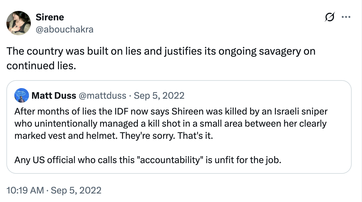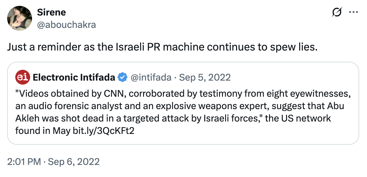 One day later, Abou-Chakra reposted a tweet from the “Electronic Intifada” account citing reporting from CNN about Abu Akleh’s death with the quote: “Just a reminder as the Israeli PR machine continues to spew lies.”