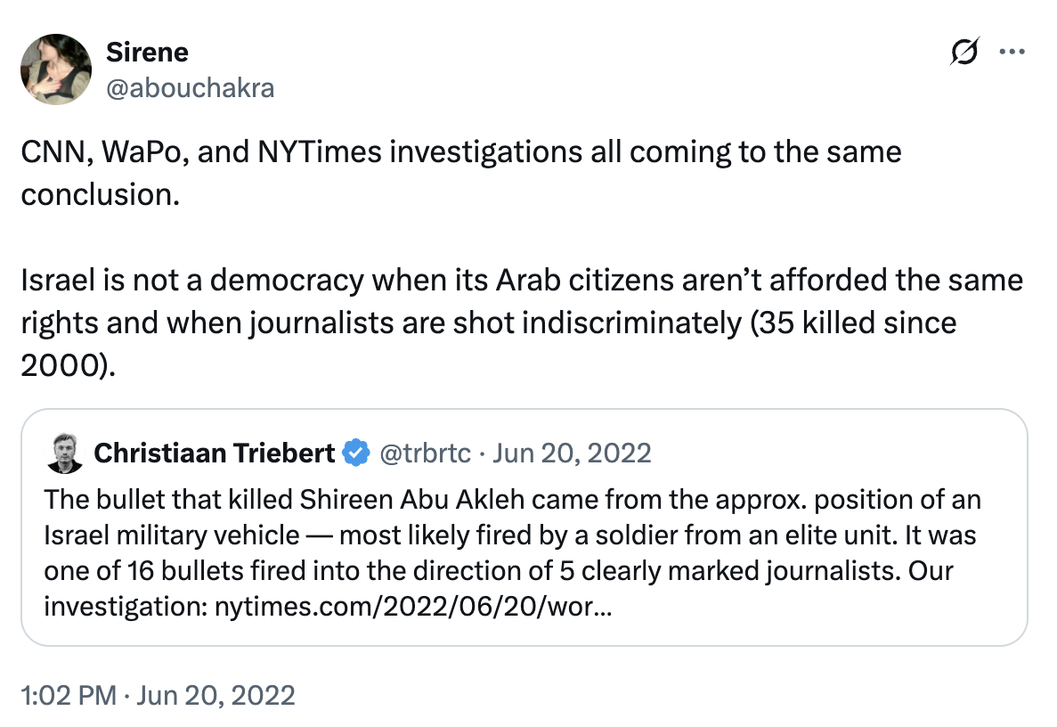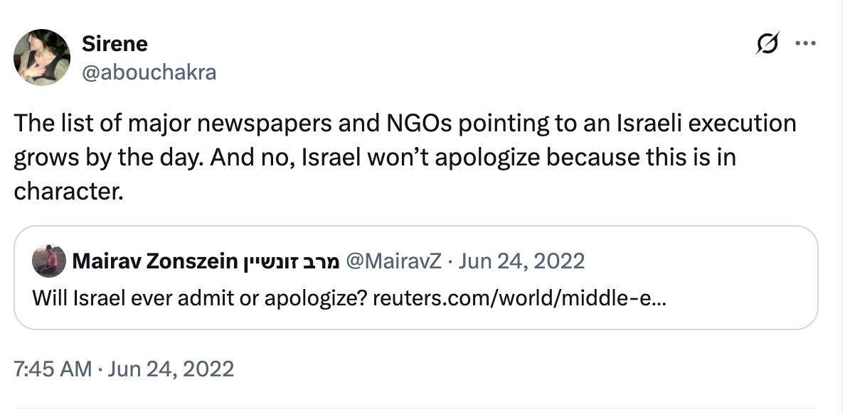Four days after that post, Abou-Chakra responded to a post asking if Israel would “ever admit or apologize” for Abu Akleh’s death, writing, “The list of major newspapers and NGOs pointing to an Israeli execution grows by the day. And no, Israel won’t apologize because this is in character.”