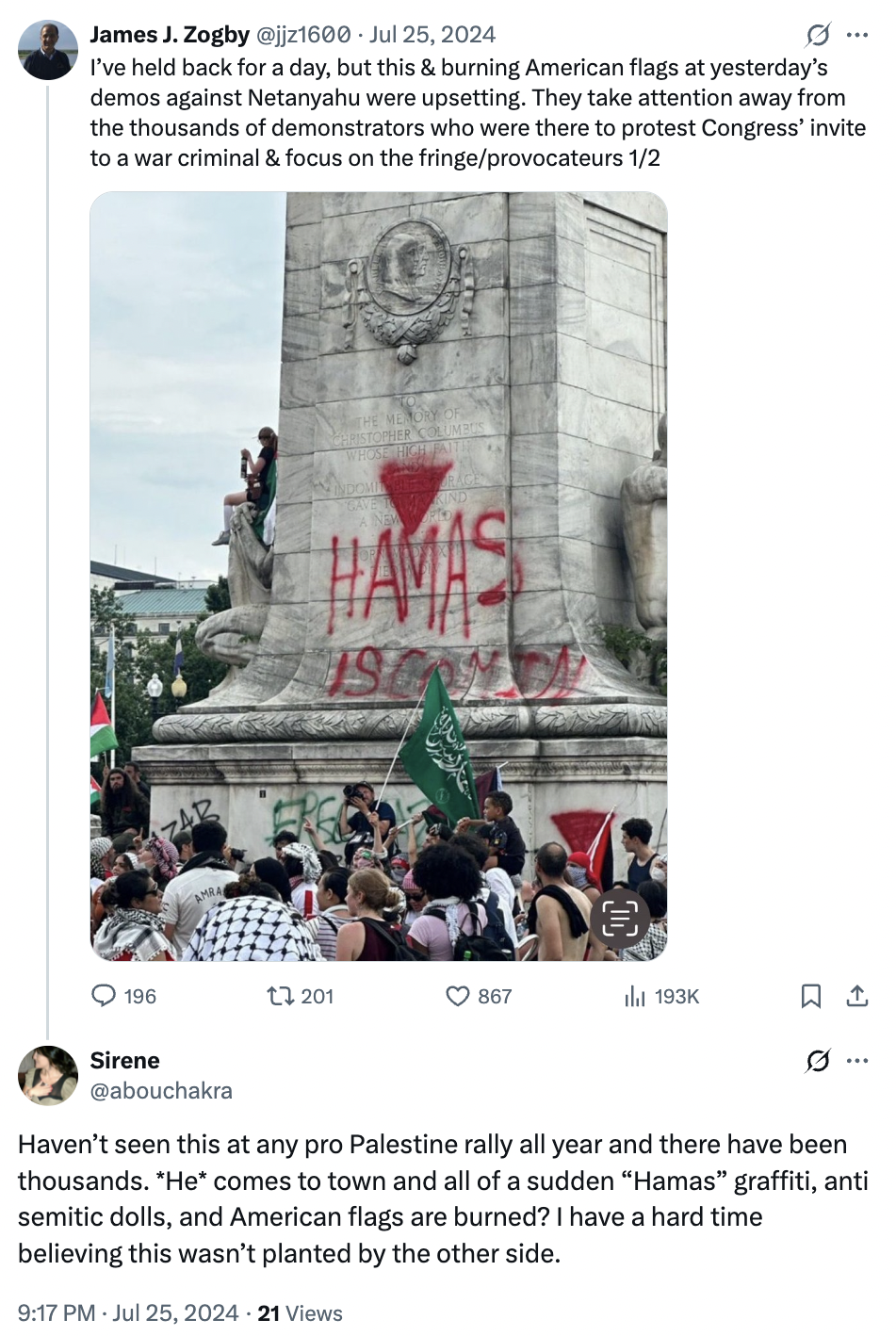“Haven’t seen this at any pro Palestine rally all year and there have been thousands. *He* comes to town and all of a sudden ‘Hamas’ graffiti, anti semitic dolls, and American flags are burned? I have a hard time believing this wasn’t planted by the other side,” she wrote.