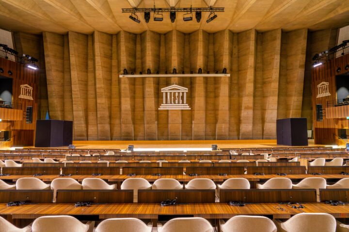 Inside of the grand auditorium of UNESCO headquarters building in Paris, France