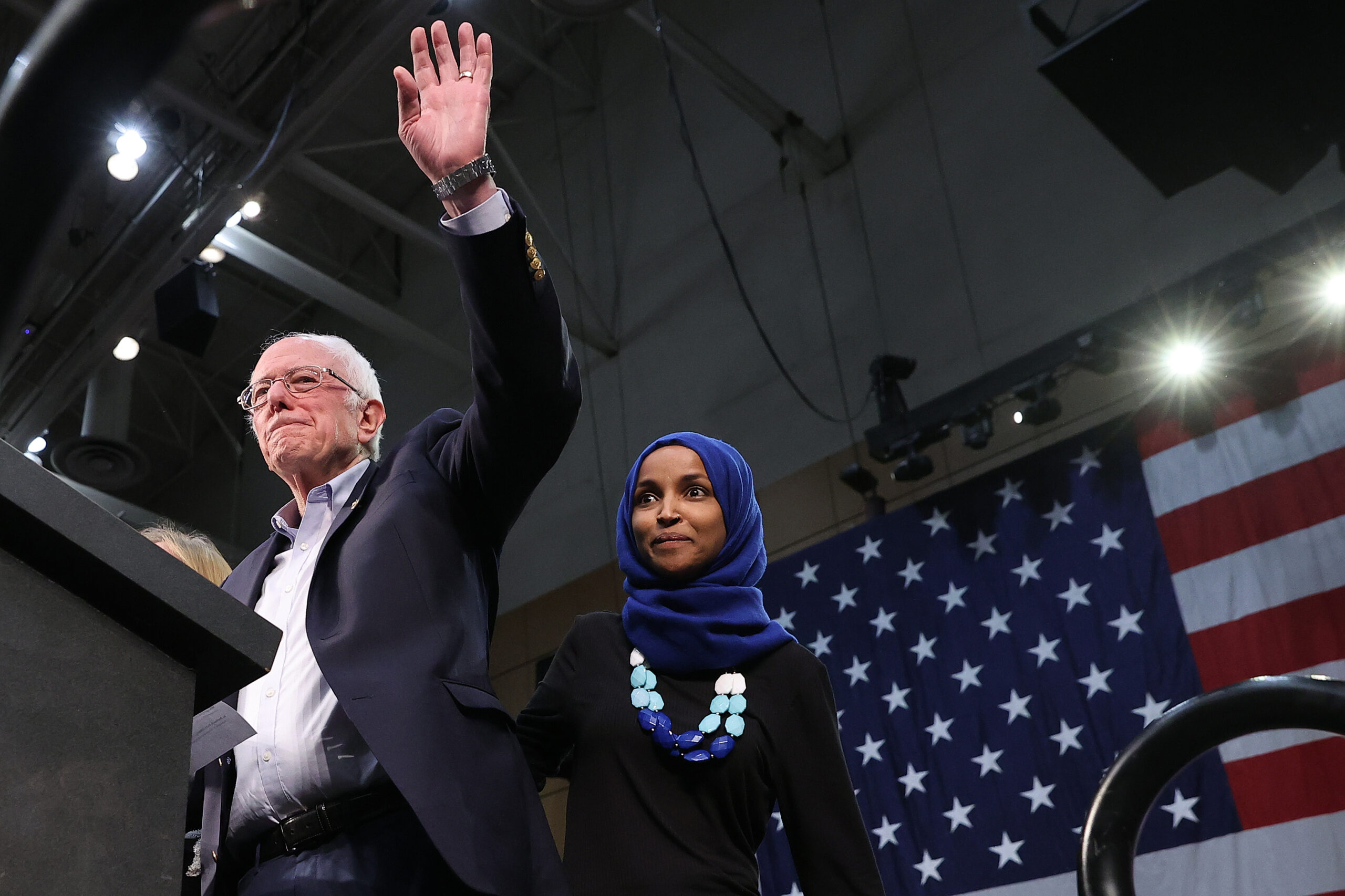 ep. Ilhan Omar (D-MN) (R) introduces Democratic presidential candidate Sen. Bernie Sanders (I-VT) during a campaign rally at the Roy Wilkins Auditorium March 02, 2020 (Photo by Chip Somodevilla/Getty Images)