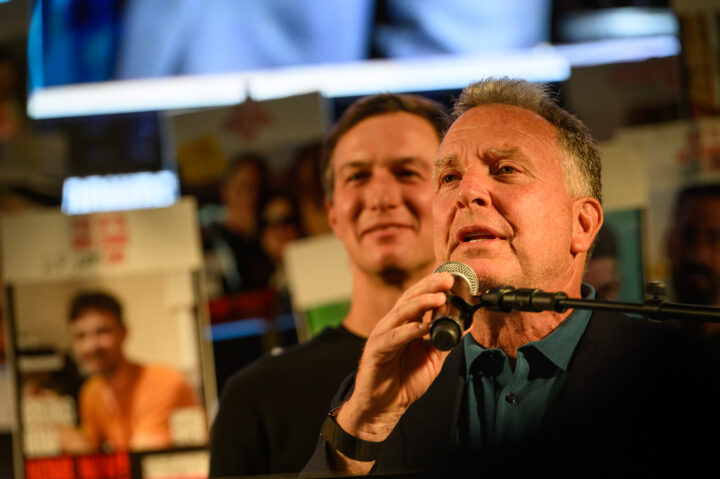 U.S. Middle East envoy Steve Witkoff (C), flanked by Jared Kushner (L), speaks at the weekly 'Bring Them Home' rally in Hostage Square Hostages Square on October 11, 2025 in Tel Aviv, Israel.