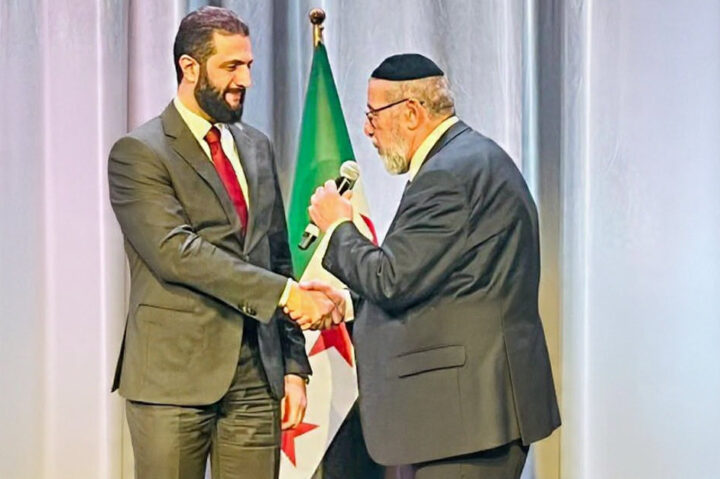 The moment produced a striking visual — a handshake between a kippah-wearing rabbi and the new president of Syria, a former Islamist terrorist affiliated with Al-Qaida and ISIS.