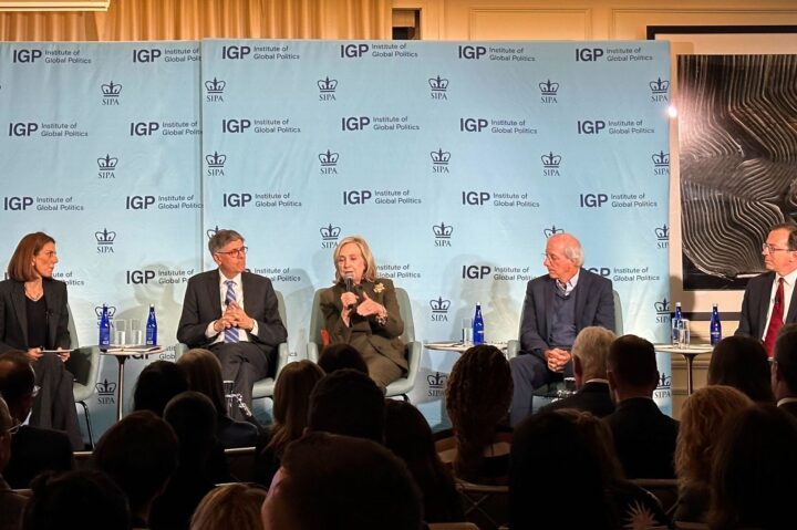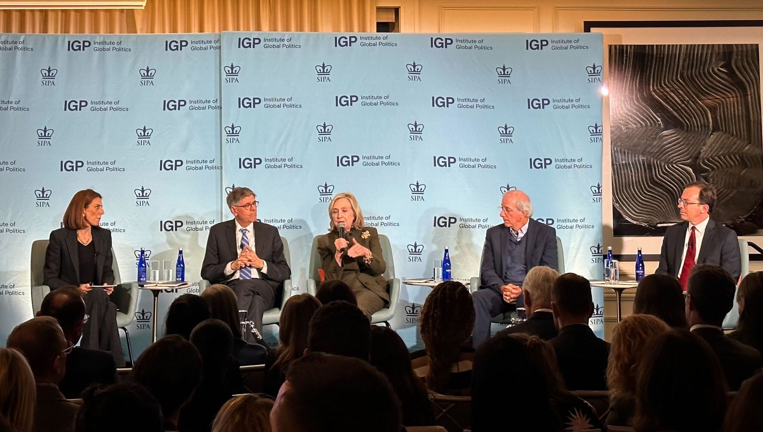 Panel discussion moderated by Keren Yarhi-Milo, dean of Columbia’s School of International and Public Affairs, features Israeli journalist Nadav Eyal; Hillary Clinton, former secretary of state; former diplomat and Middle East envoy Dennis Ross; and Jacob Lew, former ambassador to Israel. The panel was hosted by Columbia University’s Institute of Global Politics, Nov. 11, 2025.