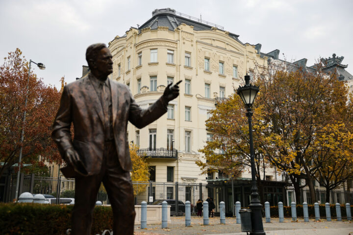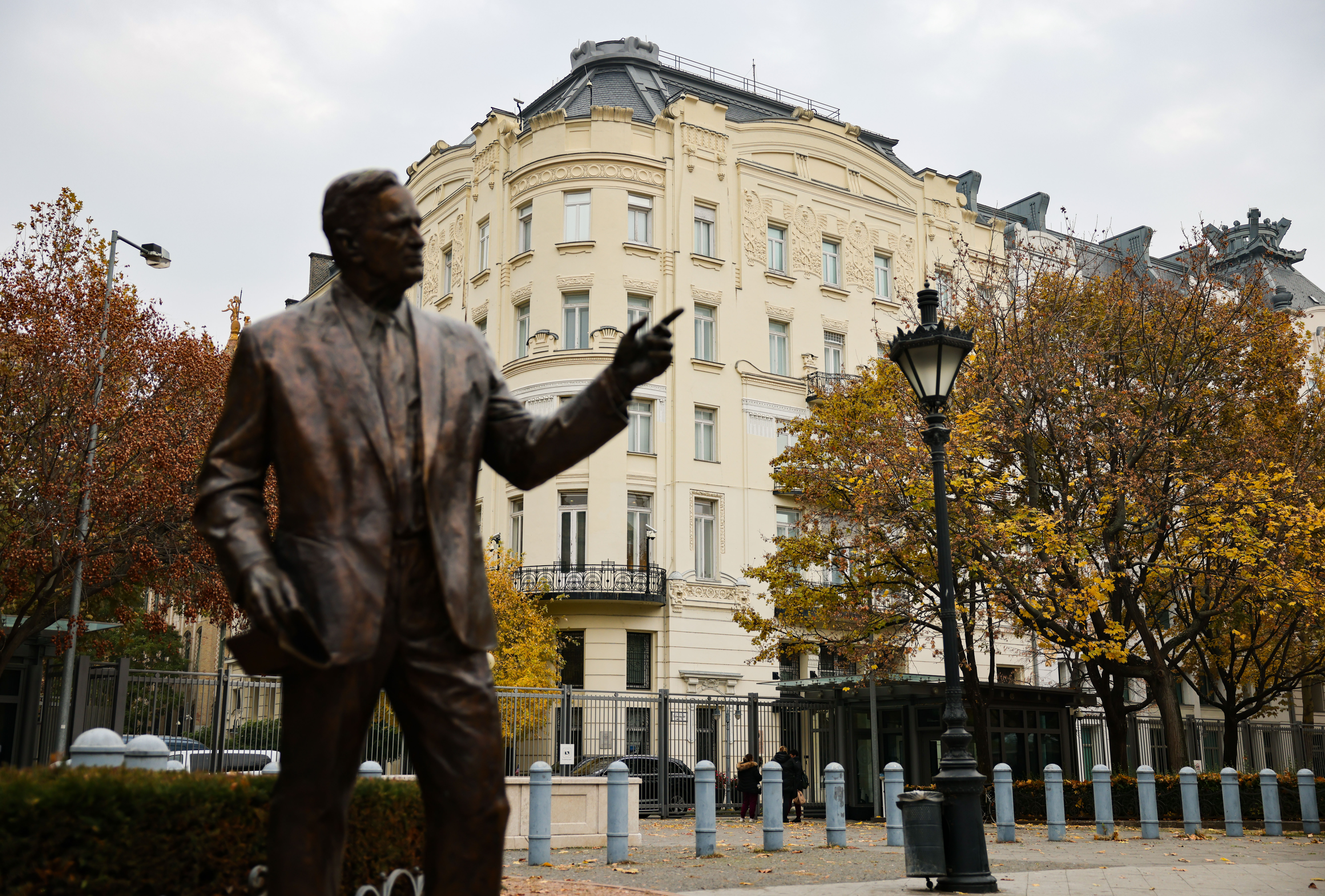 A statue shows former President George H. W. Bush in front of the Embassy of the United States of America in Budapest.