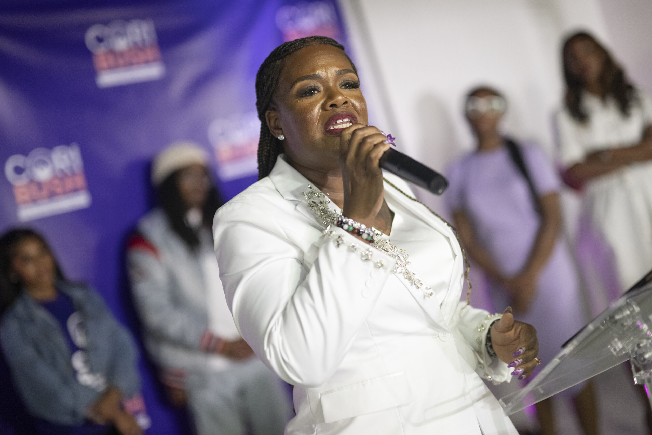 Former Rep. Cori Bush (D-MO) delivers her concession speech during a primary election watch party at Chevre Events on August 6, 2024 in St Louis, Missouri.