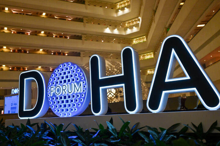 The Doha Forum logo is inside the Sheraton Grand Doha Resort & Convention Hotel in Doha, Qatar, on December 5, 2024.