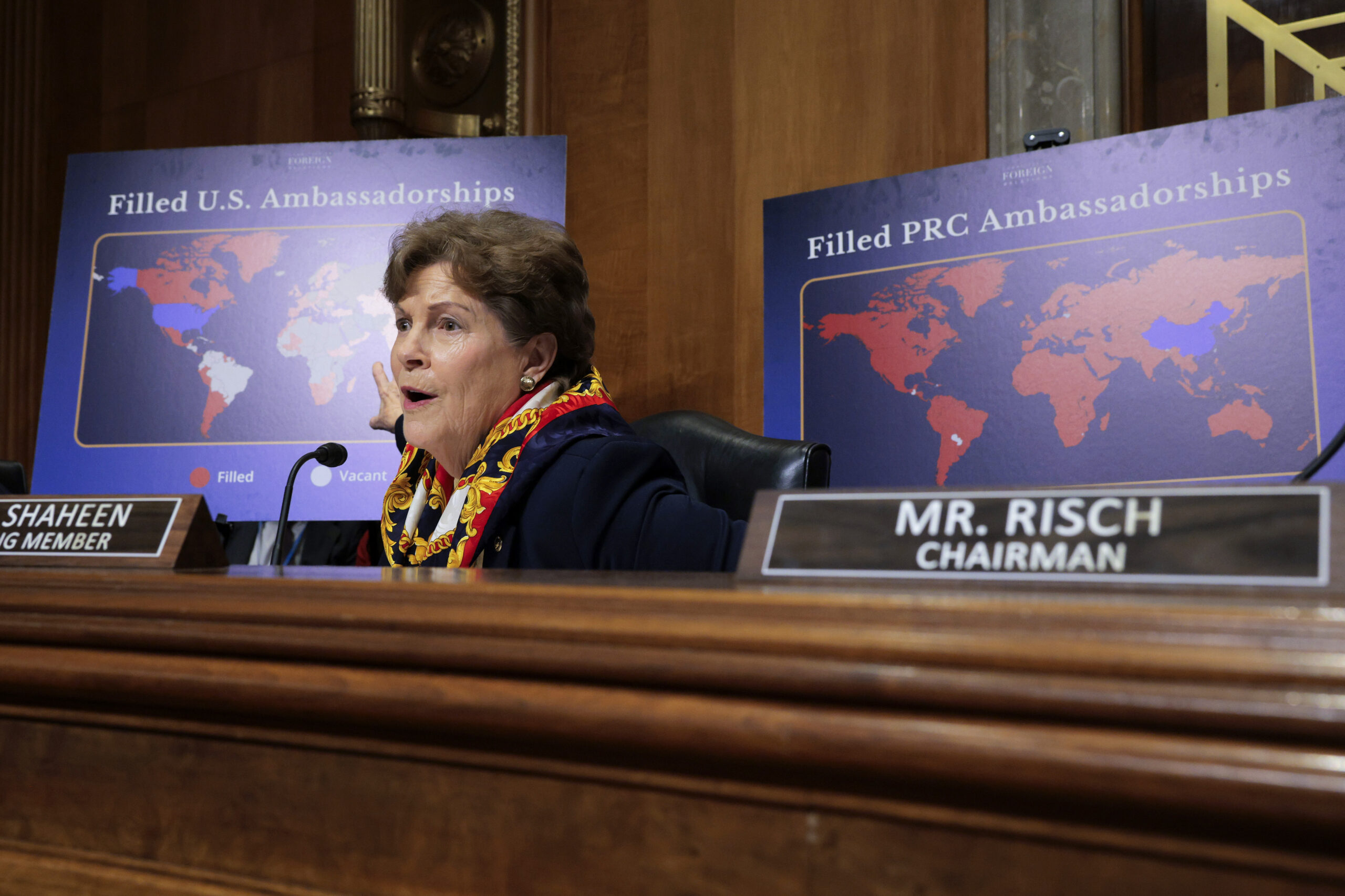 Ranking Member Sen. Jeanne Shaheen (D-NH) points to a map of filled U.S. ambassadorships as Secretary of State Marco Rubio testifies during a Senate Foreign Relations Committee hearing in the Dirksen Senate Office Building on Capitol Hill on January 28, 2026 in Washington, DC.