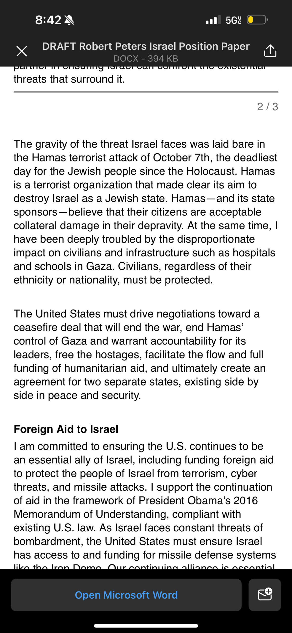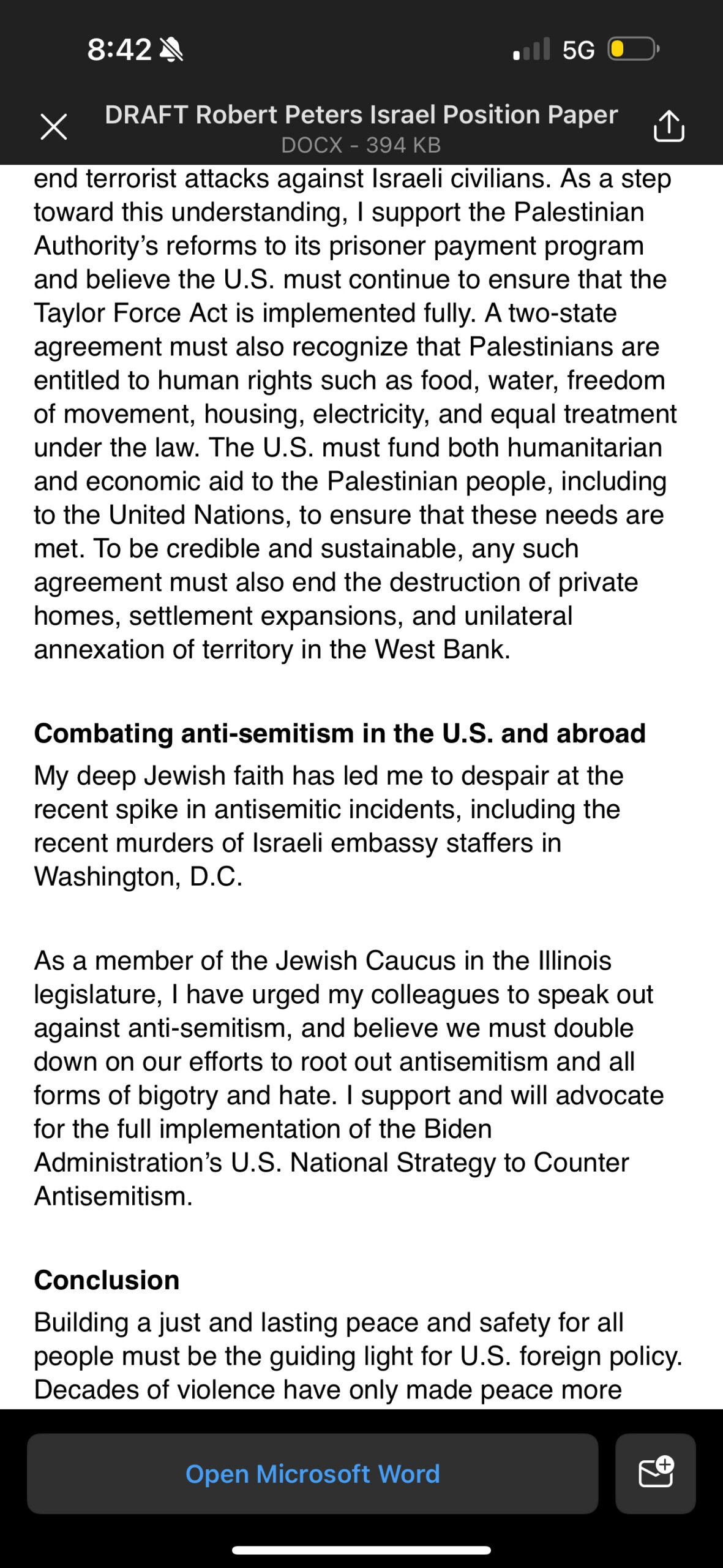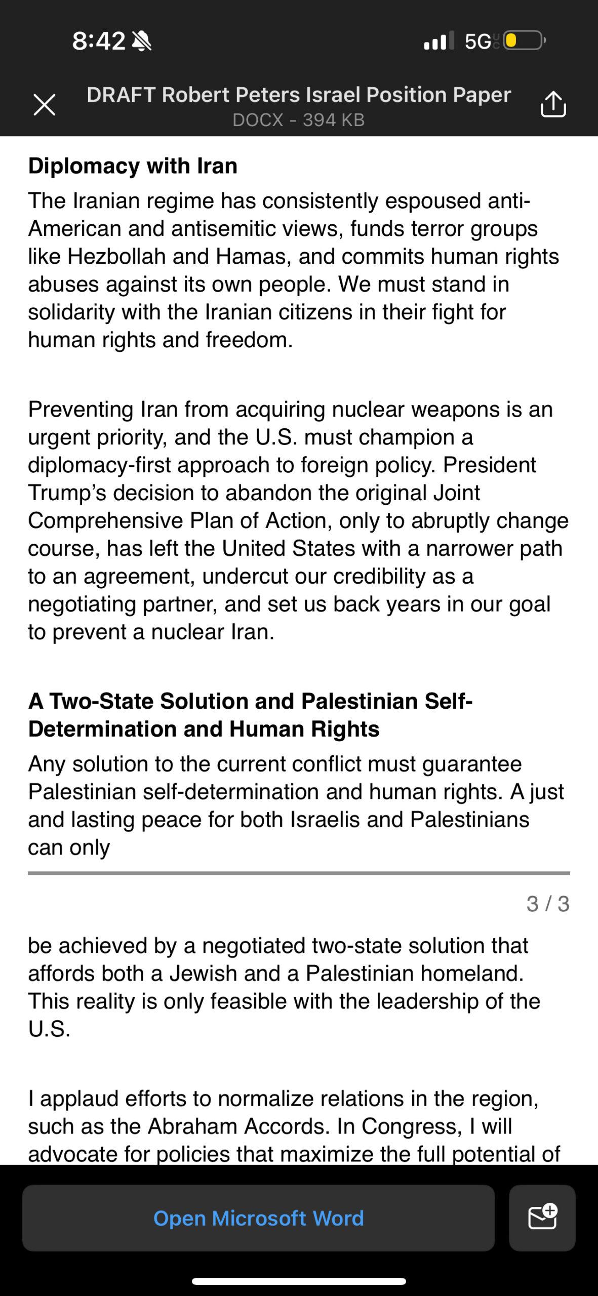 “Israel is a vital partner to the United States, and Congress must ensure that this special relationship is preserved,” Peters wrote in his paper, confirming in a separate section he is “committed to ensuring the U.S. continues to be an essential ally of Israel, including funding foreign aid to protect the people of Israel from terrorism, cyber threats and missile attacks.”
