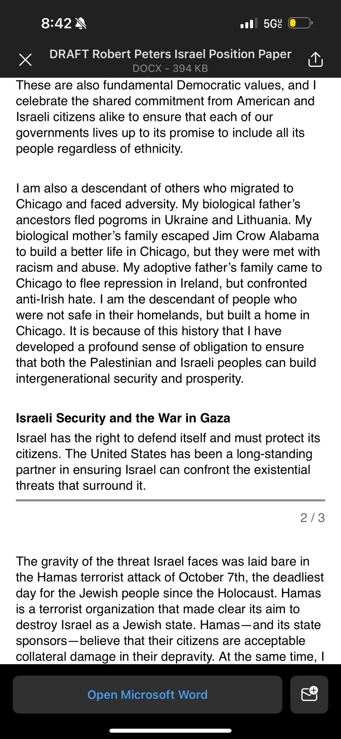 When JI first reached out to Peters’ campaign last October to inquire about the paper, Fisch said the document had been “drafted in the early months of the campaign to share with any and all stakeholders from across the spectrum of viewpoints,” and that it had “reflected Robert’s nuanced position on a range of subjects in the context of that moment.”