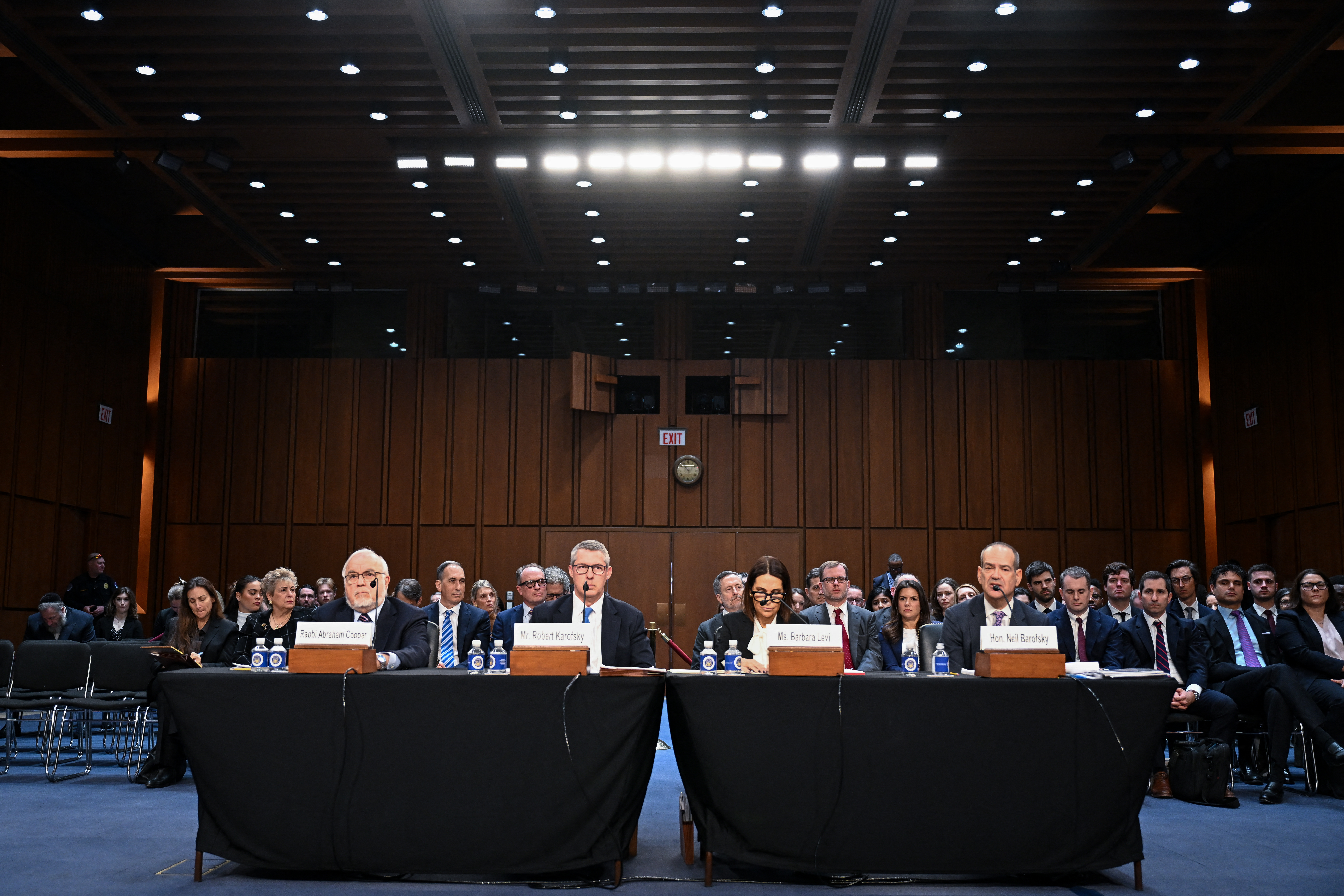 (L/R) Rabbi Abraham Cooper, Robert Karofsky, Global Wealth Management President at UBS Americas, Barbara Levi, General Counsel at UBS Group AG, and Neil Barofsky, partner at Jenner and Block LLP, testify during a Senate Judiciary Committee hearing titled "The Truth Revealed: Hidden Facts Regarding Nazis and Swiss Banks," on Capitol Hill in Washington, DC, on February 3, 2026.