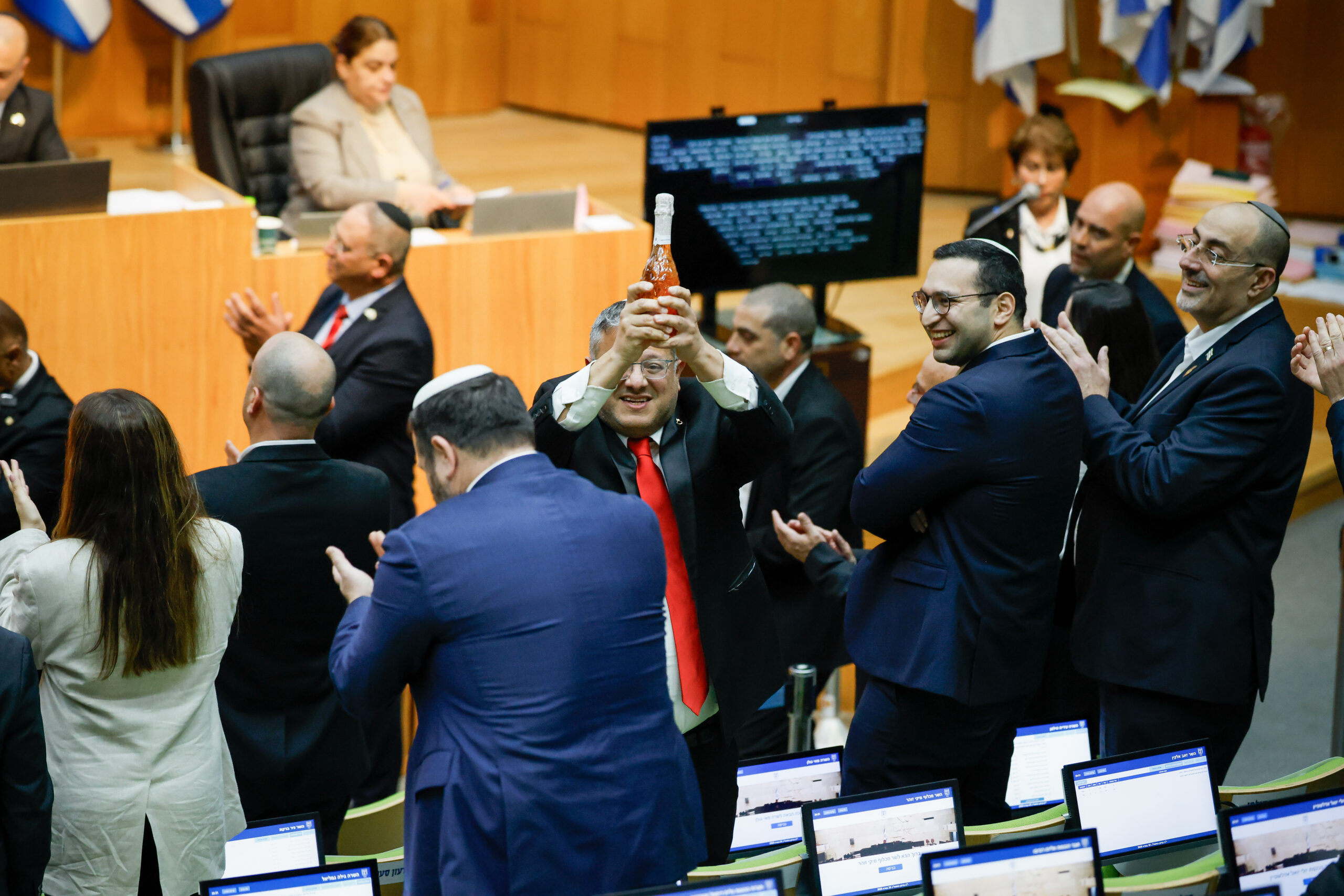 Israeli National Security Minister Itamar Ben-Gvir celebrates passage of his party's death penalty law on March 30, 2026.