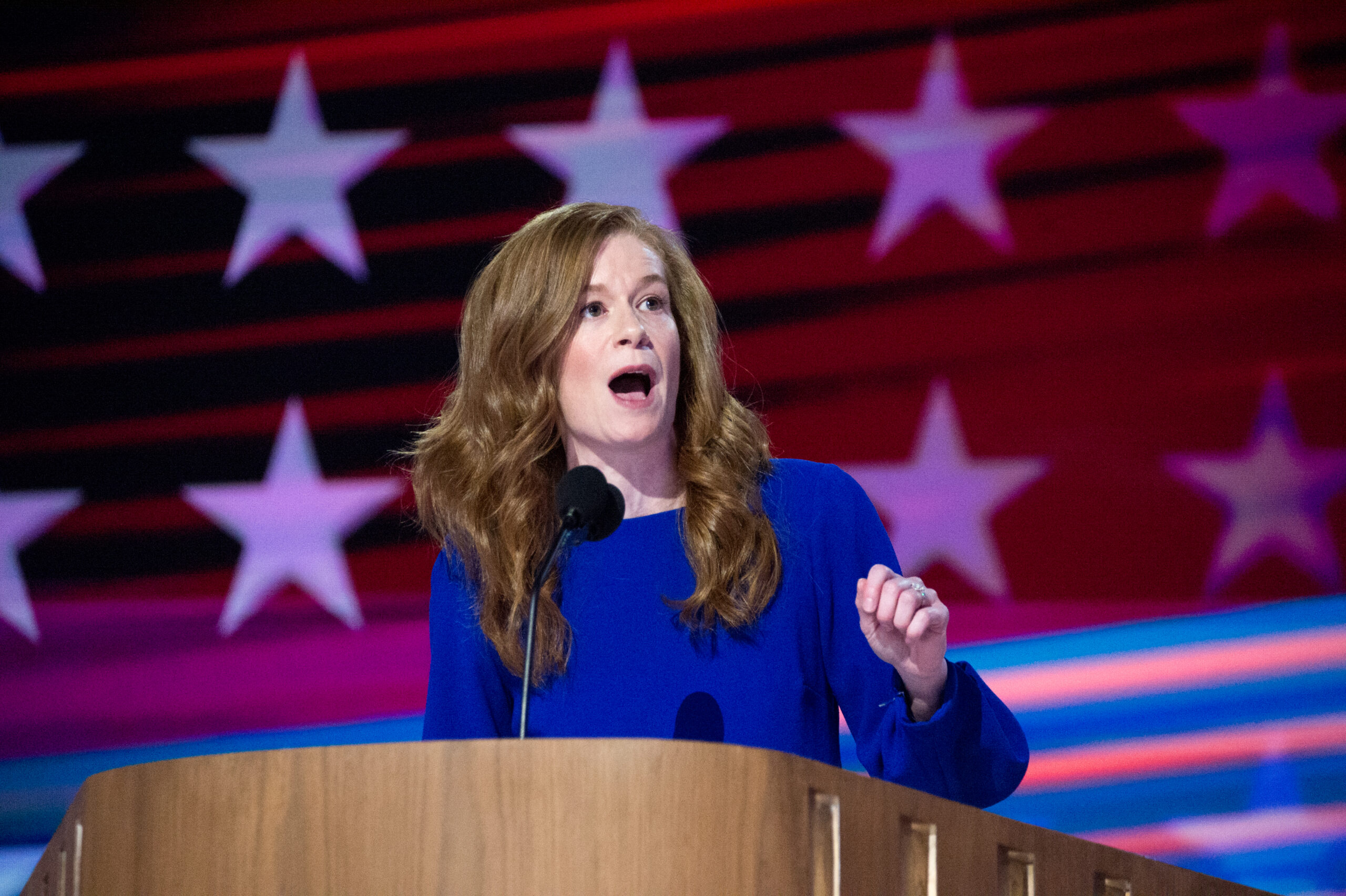 State Sen. Mallory McMorrow, a Democrat from Michigan speaks during the 2024 Democratic National Convention in Chicago, Illinois, United States on August 19, 2024.