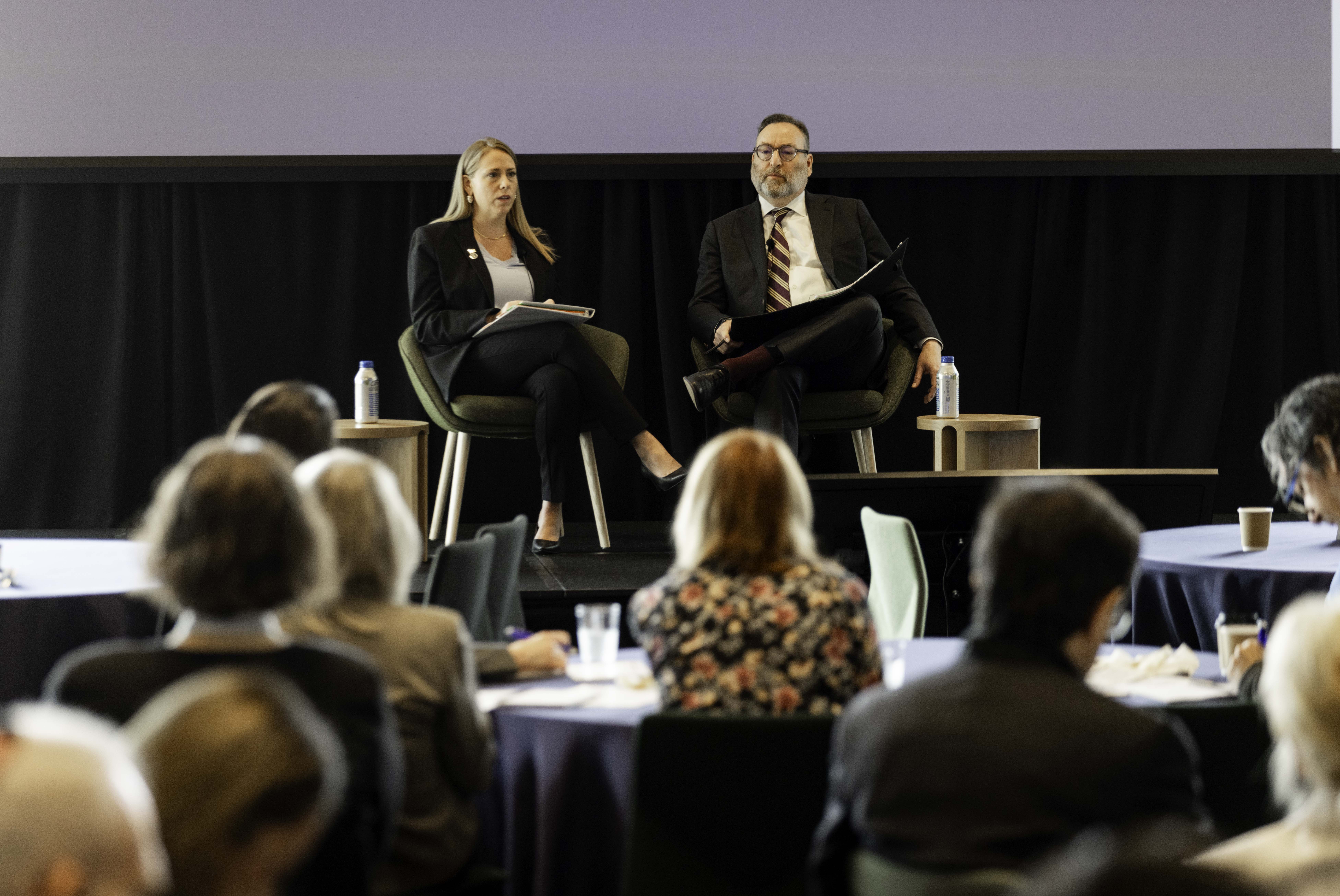 EEOC Chair Andrea Lucas and Brandeis Center founder Kenneth Marcus speak at the inaugural conference on antisemitism and civil rights law at Harvard University on April 16, 2026.