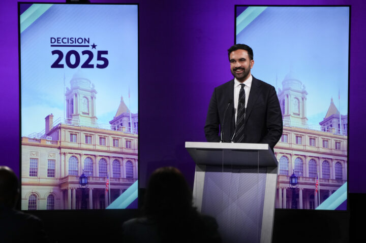 Zohran Mamdani, New York City mayoral candidate, during a mayoral debate in New York, US, on Wednesday, Oct. 22, 2025.