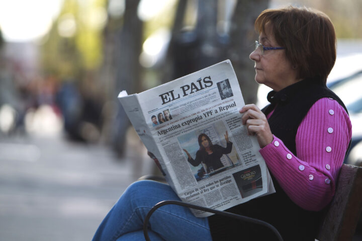A woman sits on a street bench and reads a copy of El Pais newspaper in Madrid, Spain, on Tuesday, April 17, 2012.