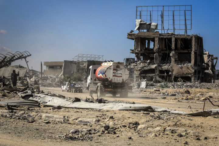 16 October 2025, Palestinian Territories, Khan Yunis: A truck carrying fuel enters Khan Yunis through the Karem Shalom crossing as part of the ceasefire agreement between Israel and Hamas.