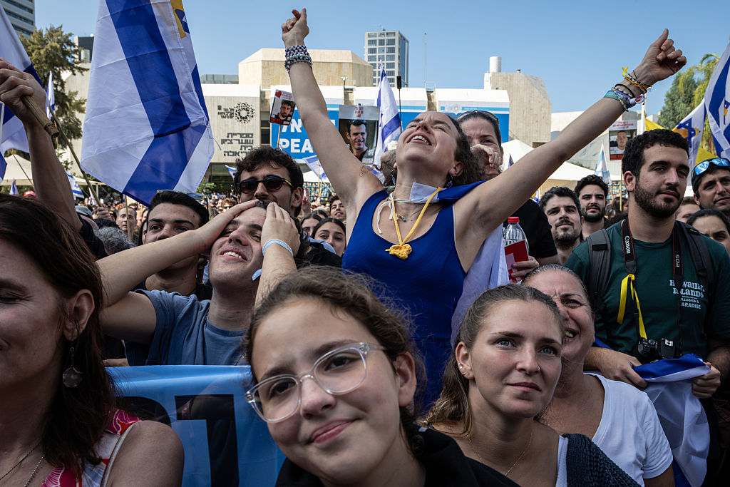 People celebrate in Tel Aviv’s Hostages Square on Monday morning as they watch a livestream of the release.