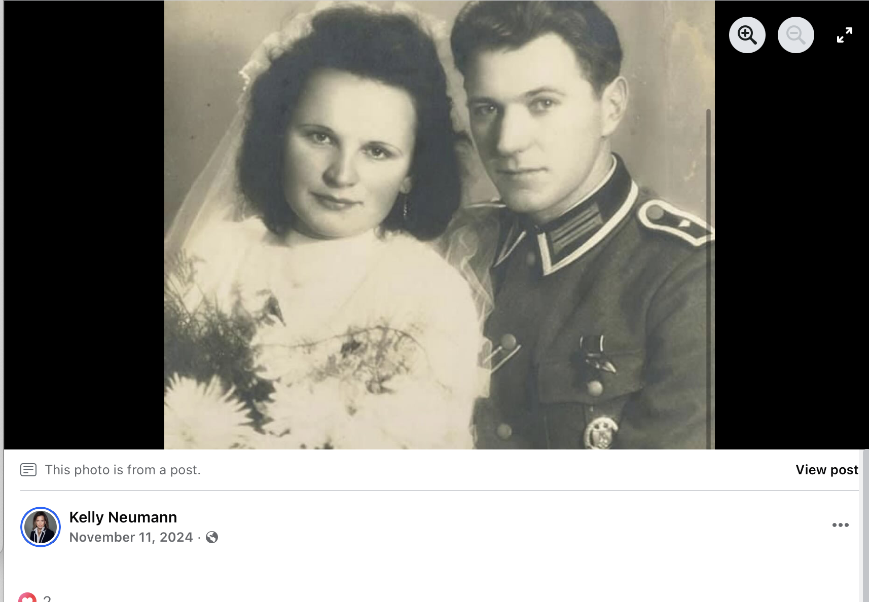 The post includes multiple photos of Neumann’s grandfather in Nazi regalia, including what appears to be an officer’s uniform.